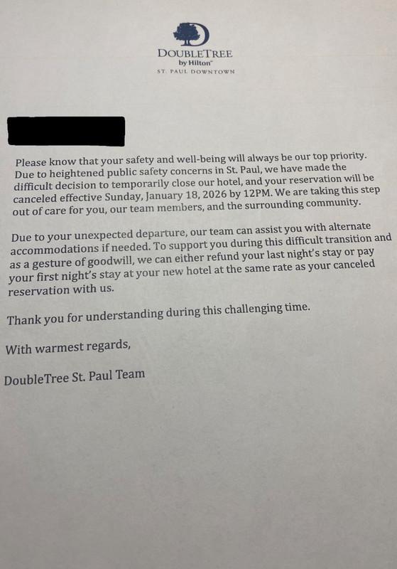 Due to heightened public safety concerns in St. Paul, we have made the difficult decision to temporarily close our hotel…” Several hotels are now closing in the Twin Cities because of safety concerns—The Double Tree downtown St. Paul sliding this notification under the door of some guests.