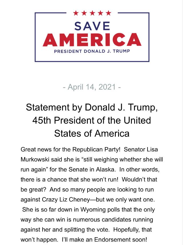 President Trump issues statement on Cheney and Lisa Murkowski